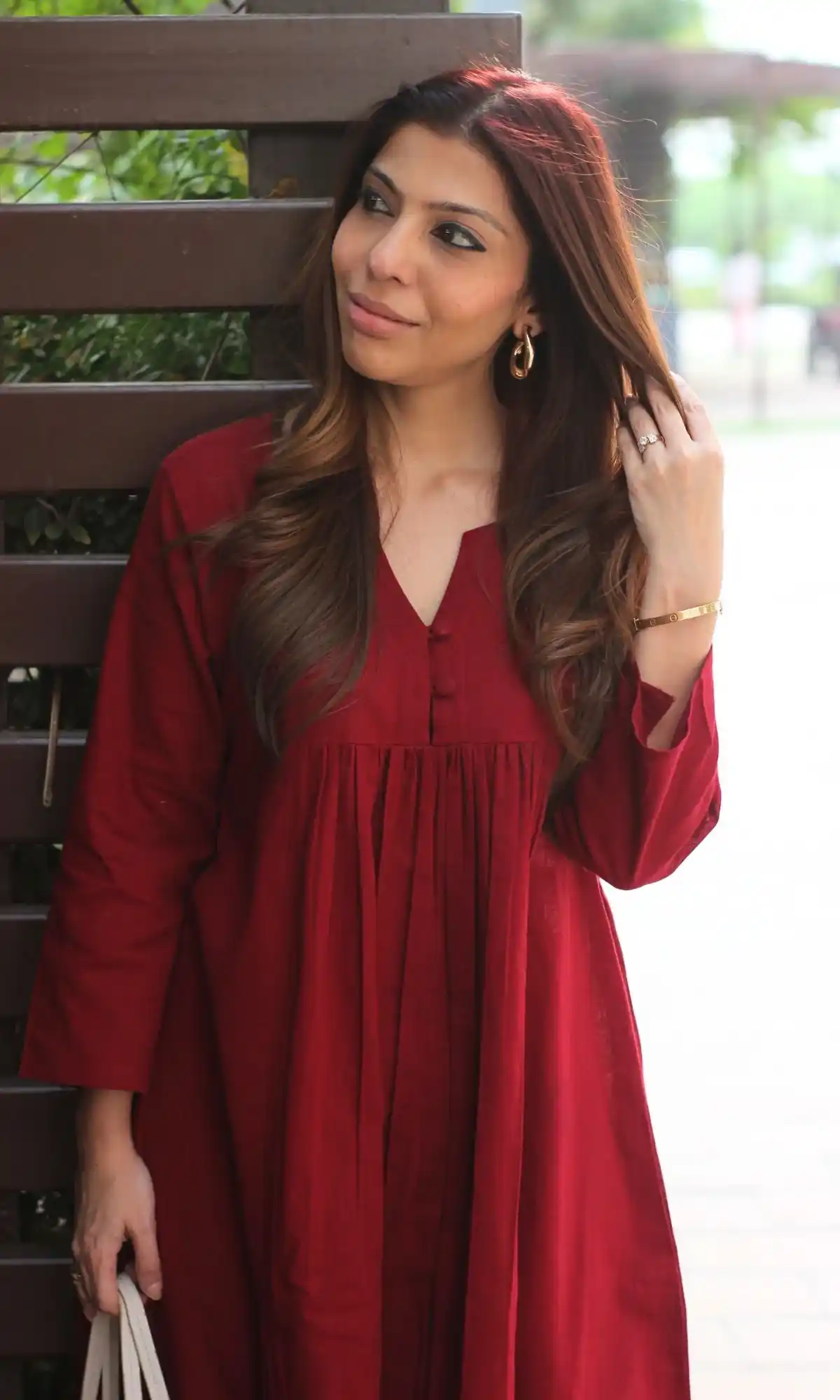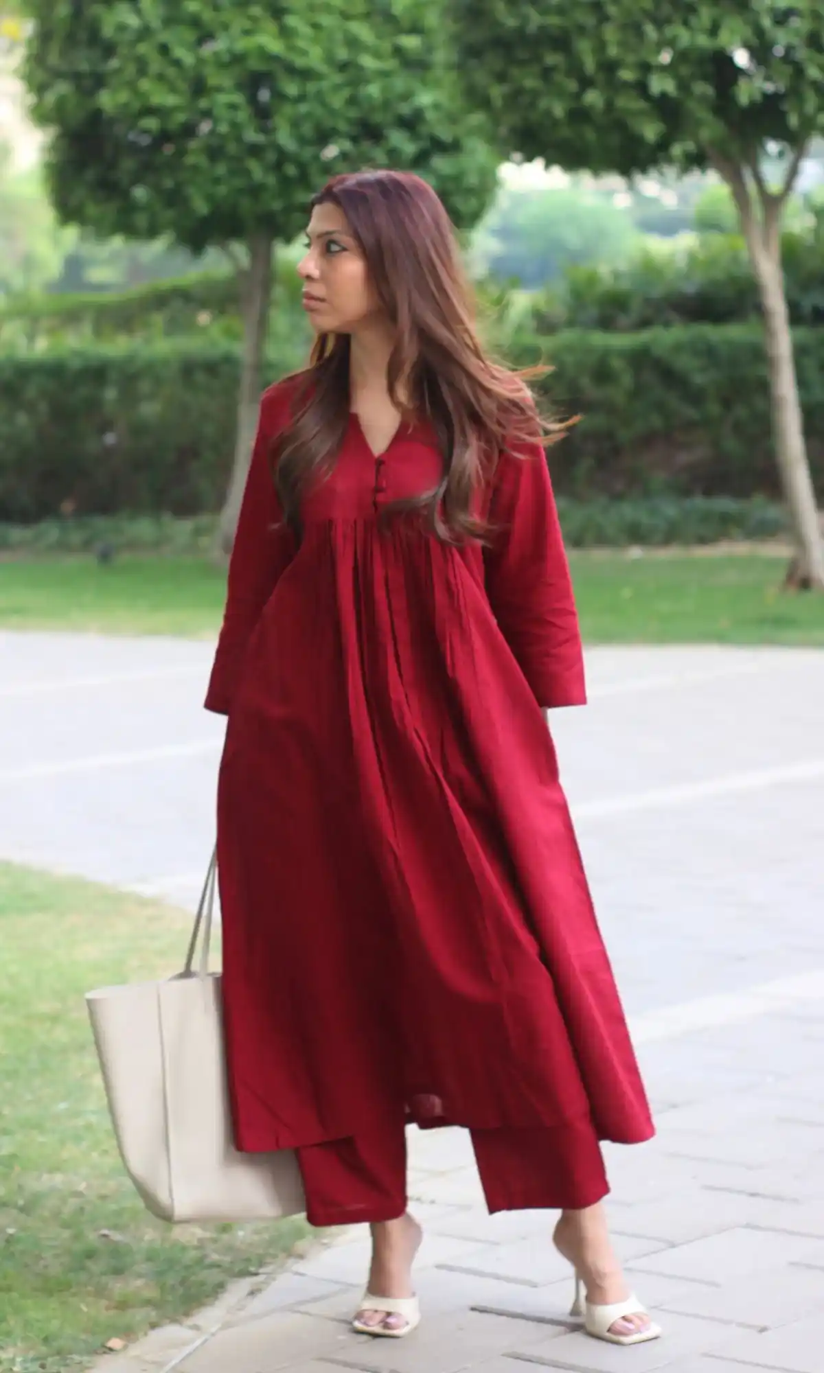 Cotton Pleated Buttoned Red Coord Set